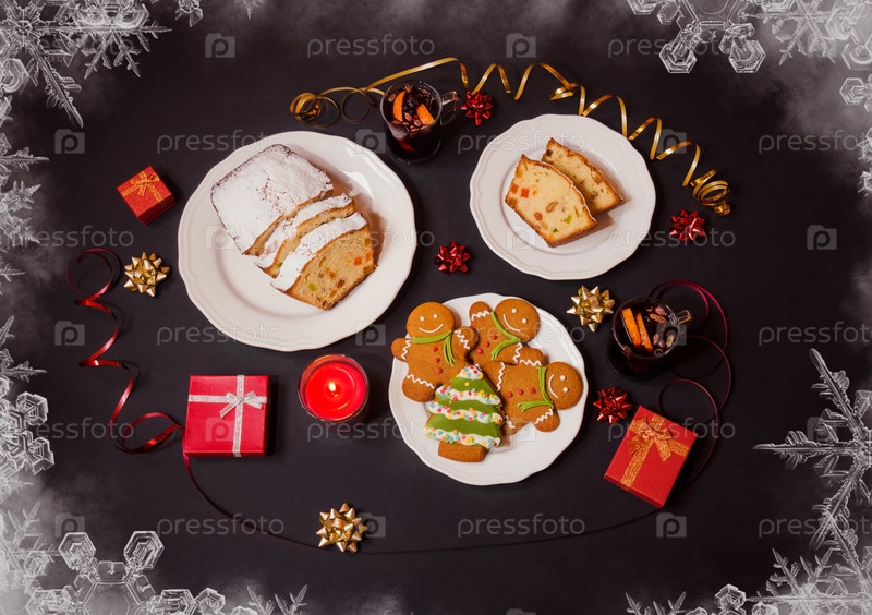Рождественские пряники, рождественский торт с цукатами и изюмом, два бокала глинтвейна, горящая свеча и подарки на темном фоне. Вид сверху