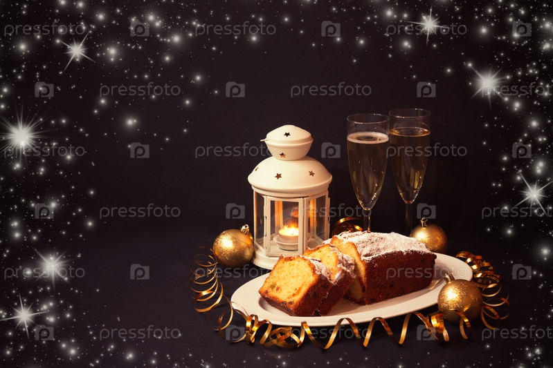 Рождественский торт с цукатами и изюмом, два бокала шампанского, горящий фонарь и рождественские украшения на темном фоне. Выборочный фокус