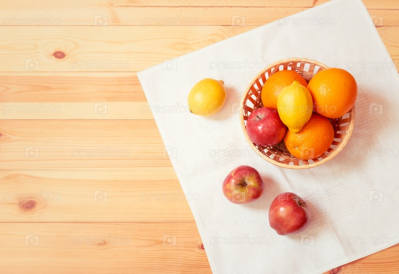 Апельсины, яблоки и лимоны в корзине на белой салфетке на столе. Вид сверху, пространство для копирования