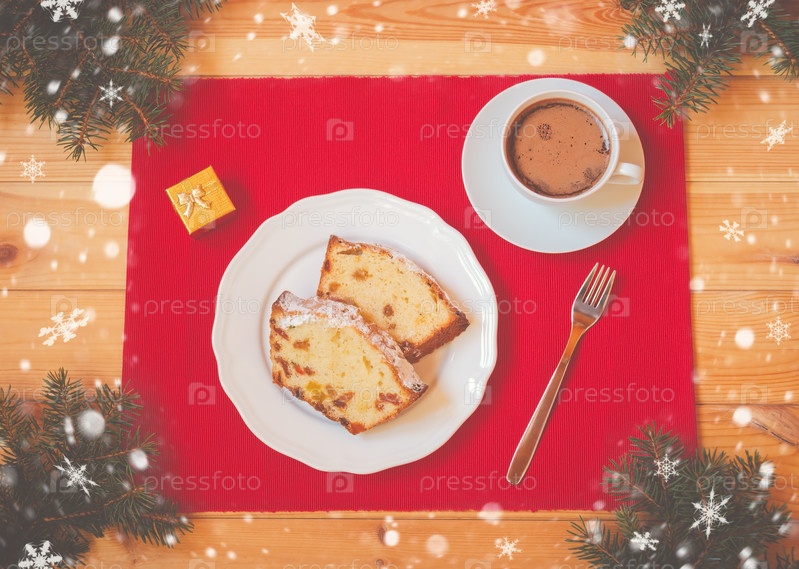 Рождественский торт с цукатами и изюмом, чашка горячего шоколада, подарочная коробка и еловые ветки на деревянном столе. Вид сверху