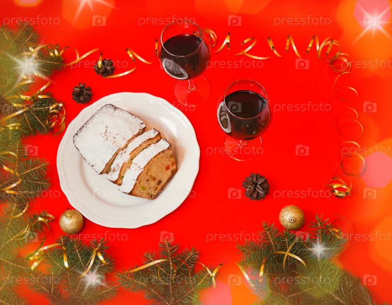 Рождественский торт с цукатами и изюмом, два бокала красного вина, еловые ветки и рождественские украшения на красном