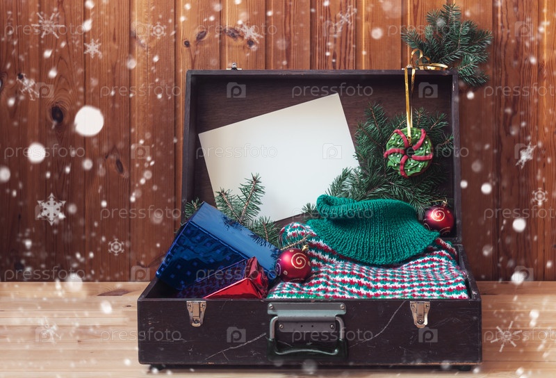 Старый чемодан с рождественскими подарками, пряничным печеньем в форме рождественского венка и шерстяным свитером