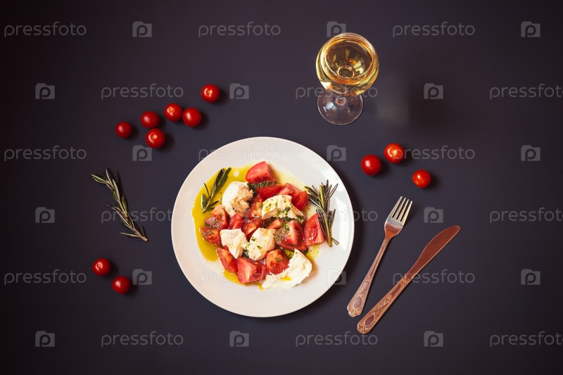 Белая тарелка с салатом капрезе, бокал белого вина и помидоры черри рядом. Вид сверху