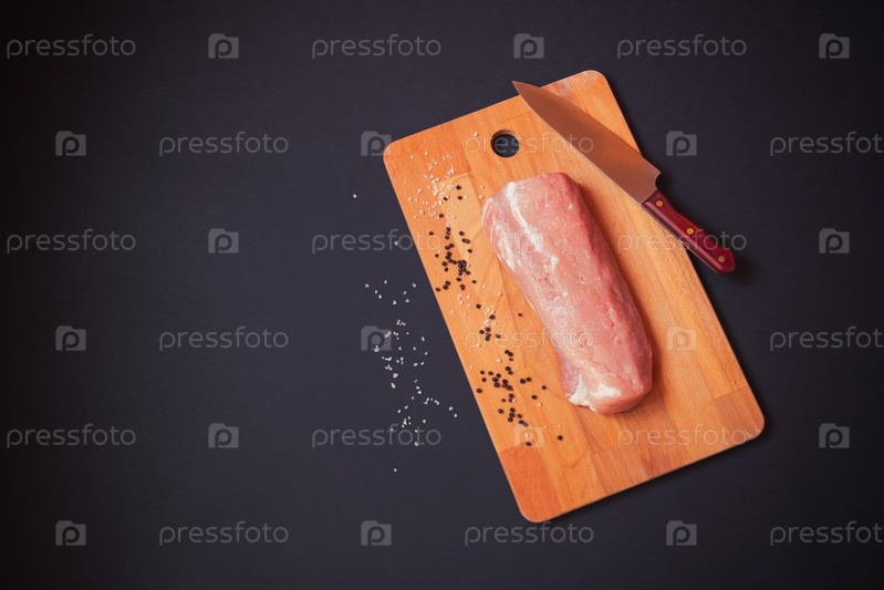 Сырая свинина. Свежее филе на разделочной доске на темном фоне