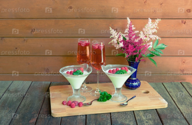 Два бокала розового шампанского, домашний итальянский десерт панакота и цветы астильбы на деревянном столе. Просмотр с копией пространства