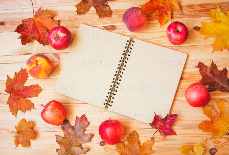 Пустой блокнот как место для копирования текста в окружении осенних листьев и свежих фруктов