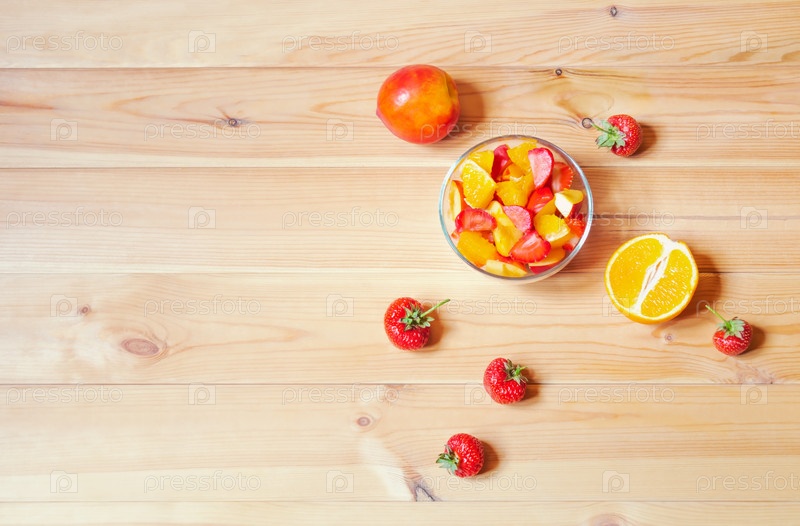 Фруктовый салат и свежие фрукты на деревянном столе. Вид сверху, пространство для копирования