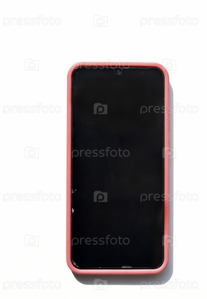 Смартфон в красном корпусе и с черным экраном. Красный телефон на белом фоне