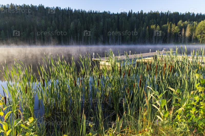 Россия. Сортировка. Камыши на озере. Природа Карелии. Туманное утро. Природа Карелии