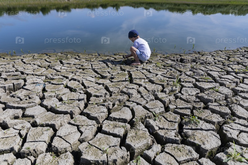 Россия.Санкт-Петербург.Мальчик на берегу Которского озера.Разломы в земле от засухи.Россия.Санкт-Петербург.Мальчик на берегу Озера Копор.Расщелины в земле от засухи