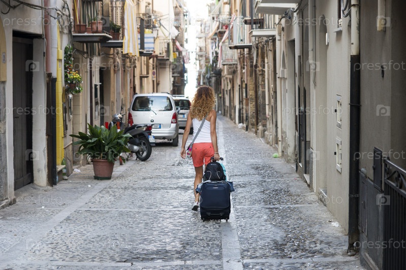 Италия. Сицилия, Чефалу. Турист на курорте. Девушка с чемоданом во время путешествия. Италия. Сицилия, Цефалу. Турист на курорте. Девочка со чемоданом во время путешествий
