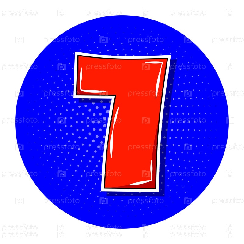 Поп-арт красный номер 7 над синим пунктирным кругом. Векторная иллюстрация