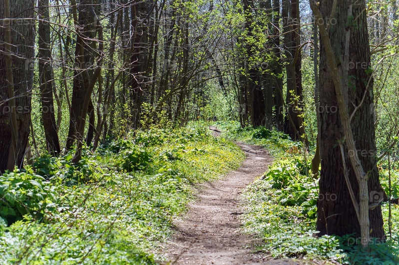 Лес весной. Молодые маленькие листья на деревьях. Боковой солнечный свет