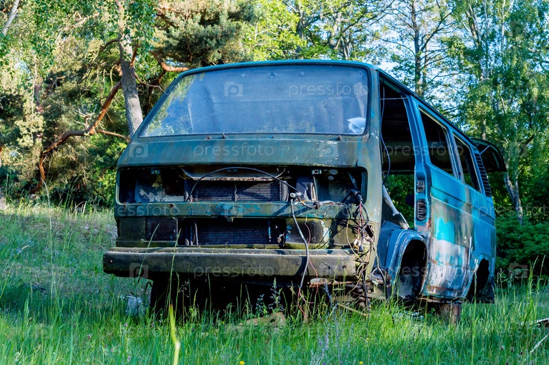 Брошенная машина в лесу. Старый, поврежденный автомобиль. Дефектный автомобиль. Автомобиль, непригодный для дорог