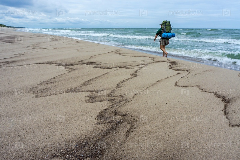 Прогулка по берегу моря. Мужчина с большим рюкзаком. Турист идет вдоль морского побережья