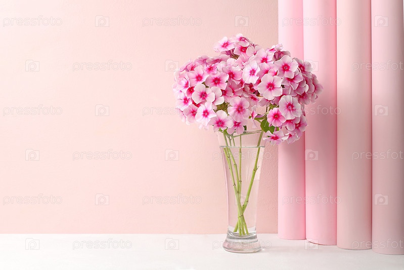 Домашний интерьер с элементами декора, красивые цветы флокса в вазе на светлом фоне, абстрактная цветочная композиция, натюрморт с местом для текста, цветочная открытка на день рождения, свадьба, выборочный фокус