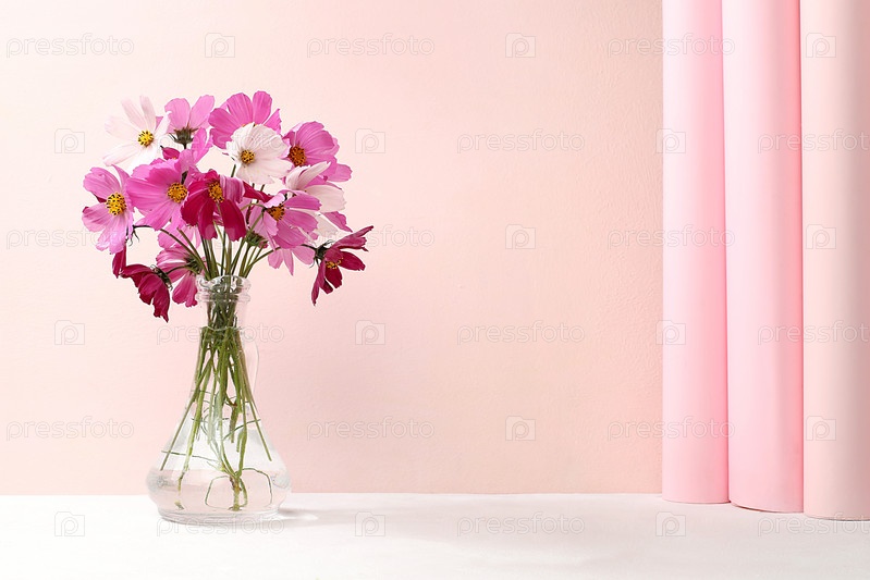 Красивые космеи в вазе на светлом фоне, абстрактная цветочная композиция, домашний интерьер с элементами декора, натюрморт с местом для текста, цветочная открытка на день рождения, свадьба, выборочный фокус
