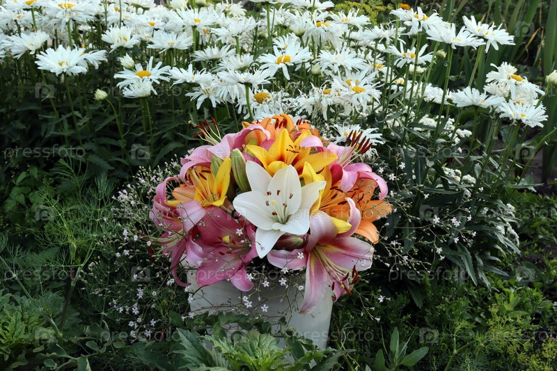 Букет разноцветных лилий и воздушной гипсофилы на фоне клумбы с белыми ромашками