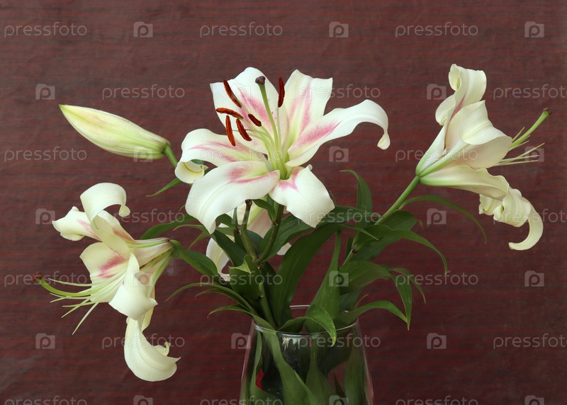 Белые элегантные лилии (восточный гибрид) в стеклянной вазе на размытом деревянном фоне