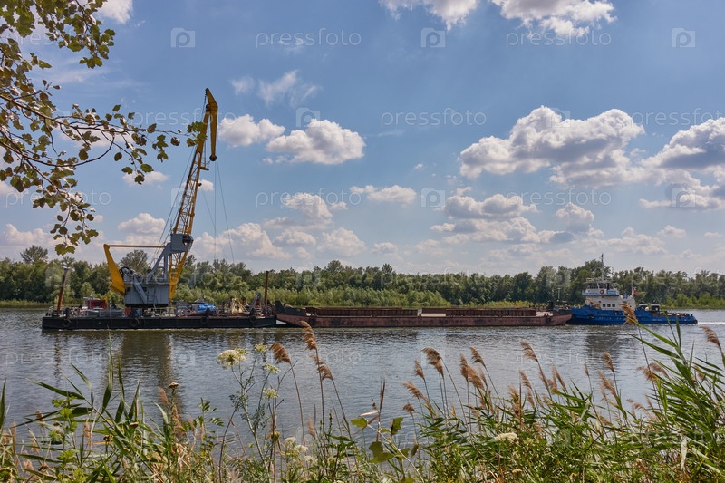 Речной буксир перевозит по реке портовый кран, загруженный на платформу