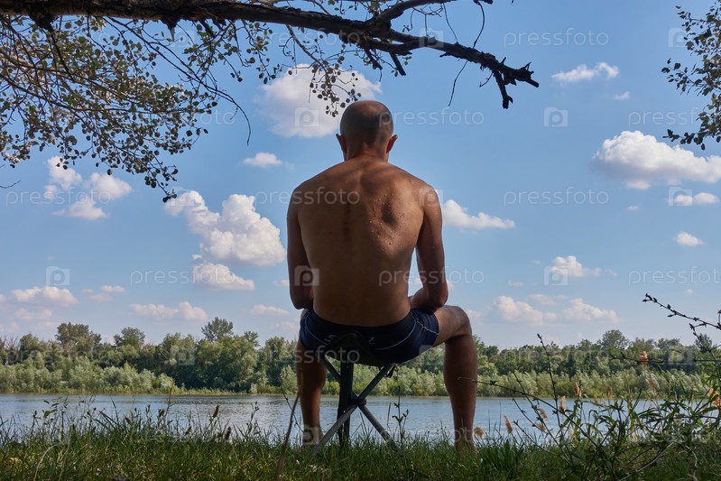 Мокрый, после купания мужчина в плавках сидит на раскладном стуле на берегу реки и смотрит на воду. Небо в облаках