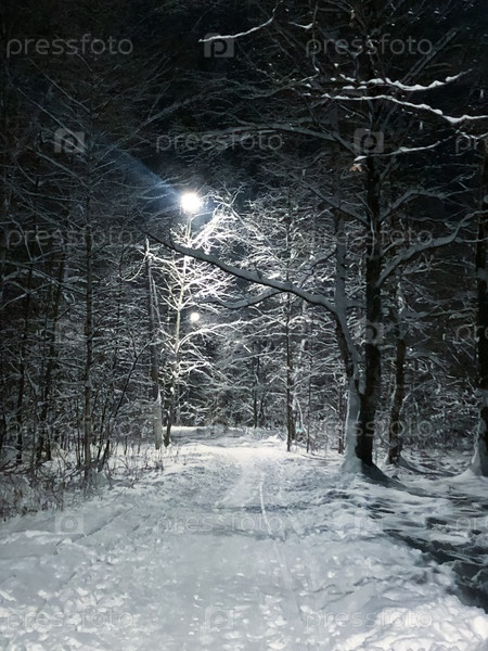 Ночной пейзаж со снежной дорожкой между рядами заснеженных деревьев, освещенный светом уличных фонарей зимним вечером