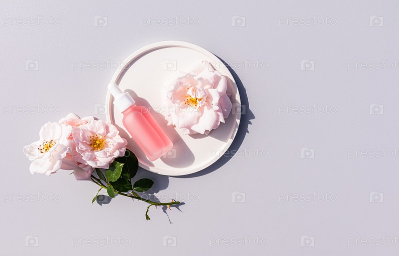 Косметика, сыворотка в белой матовой бутылке для ухода за кожей лица и тела лежит на белой тарелке. серый фон. копировать пространство. Роза. вид сверху