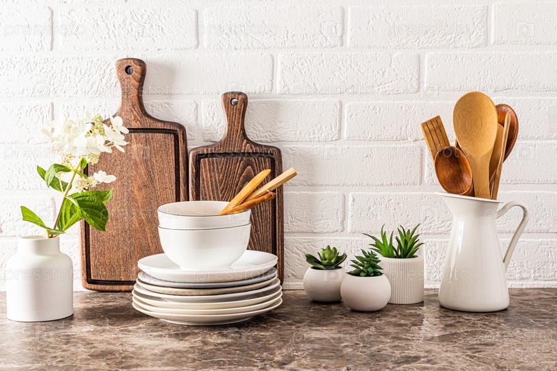 Набор стильных кухонных утварей, тарелок, мисок, разделочных досок, ложек на темной мраморной столешнице напротив белой кирпичной стены