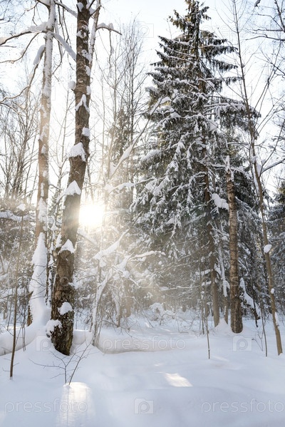 Солнечный луч пробивается сквозь заснеженные стволы деревьев в зимнем лесу