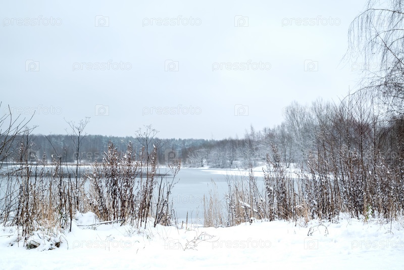 Зимний пейзаж с замерзшим озером и сухими заснеженными растениями и безлистными деревьями на горизонте