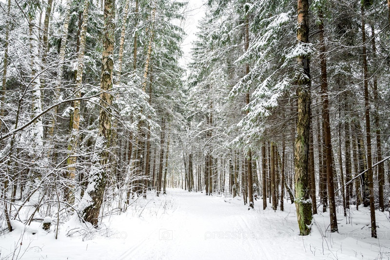 Заснеженная дорога через ели и березы в зимнем лесу