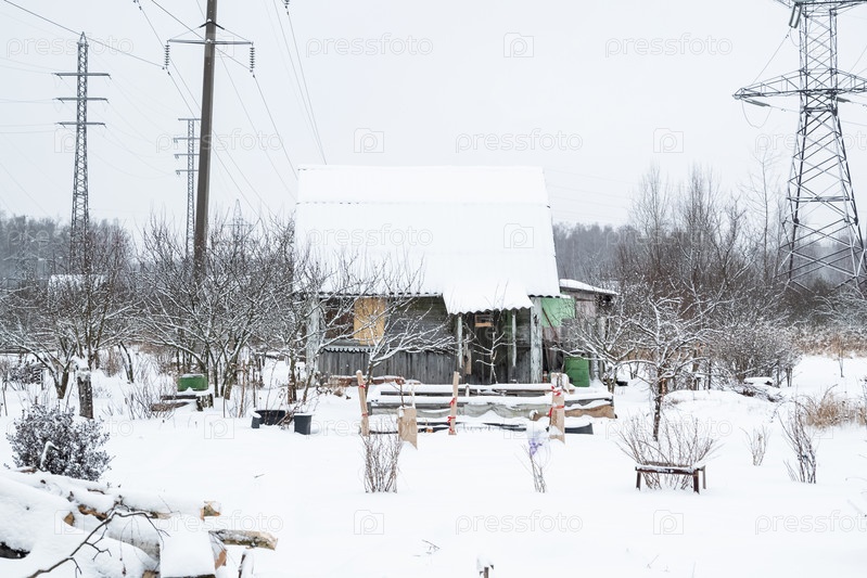 Заснеженный загородный участок со старым деревянным домом в зимний сезон