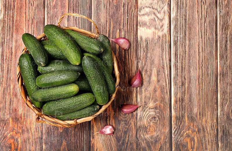 Огурцы в корзине и чеснок на деревянном столе, деревенский урожай, домашний рецепт маринования, огурцы и ингредиенты для их маринования, концепция домашнего консервирования, здоровая и натуральная пища