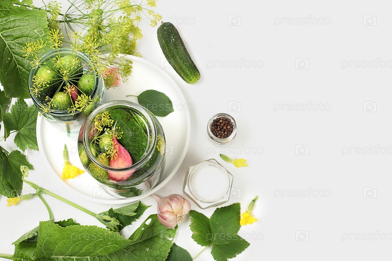 Огурцы и ингредиенты для их засолки, концепция домашнего консервирования, здоровое и натуральное питание. Огурцы, укроп, чеснок, листья смородины, вишня, хрен, дуб и базилик, рецепт деревенского рассола,