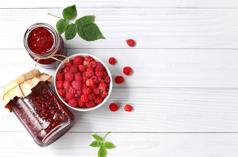 Банки с малиновым джемом на светлом деревянном фоне с листьями, баннер и реклама магазина, концепция здоровой натуральной пищи, концепция домашнего консервирования, деревенский урожай, завтрак с ингредиентами, избирательный фокус