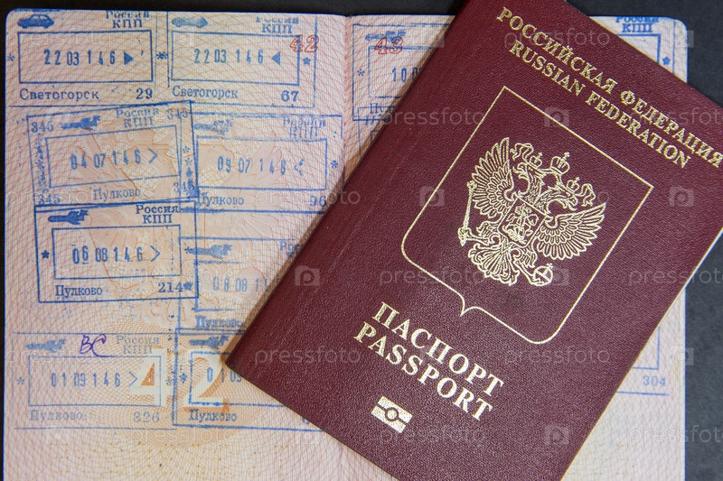 Россия. Санкт-Петербург. Документы для путешествий. Российский загранпаспорт и штамп о пересечении границы. Россия. Санкт-Петербург. Путевые документы. Русский иностранный паспорт и печать на пограничном пункте