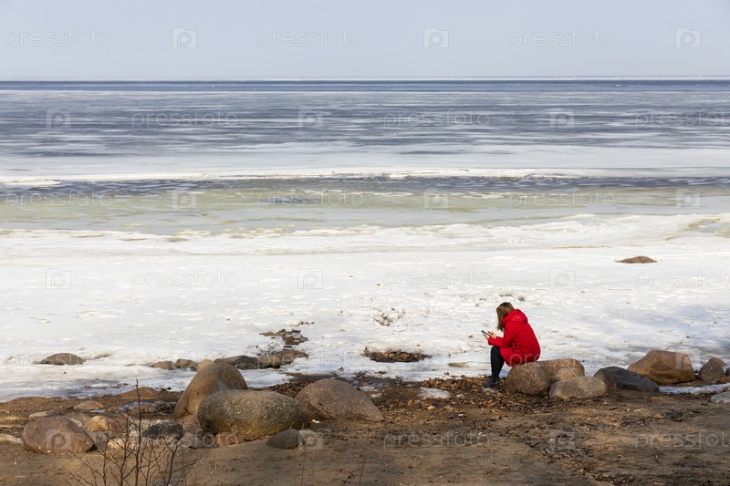 Россия. Санкт-Петербург. Девушка сидит на берегу водоема. Лед в Финском заливе. Россия. Санкт-Петербург. Девочка сидит на берегу пруда. Лед в Финском заливе