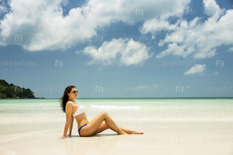 Вьетнам. Фукуок. Девочка сидит на берегу океана. Летний пляжный отдых. Вьетнам. Остров Пху Куок. Девушка сидит на берегу океана. Летние пляжные каникулы