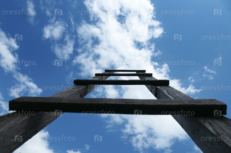 Россия. Санкт-Петербург. Вид на лестницу снизу. Облака различной формы в голубом небе. Россия. Санкт-Петербург. Вид на ступеньки снизу. Облака разных форм в синем небе