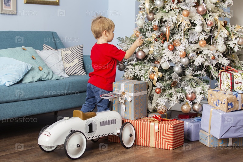 Россия. Санкт-Петербург. Праздник Новый год. Ребенок у новогодней елки с украшениями и подарками. Новогодние праздники. Ребёнок возле рождественской ёлки с декорациями и подарками
