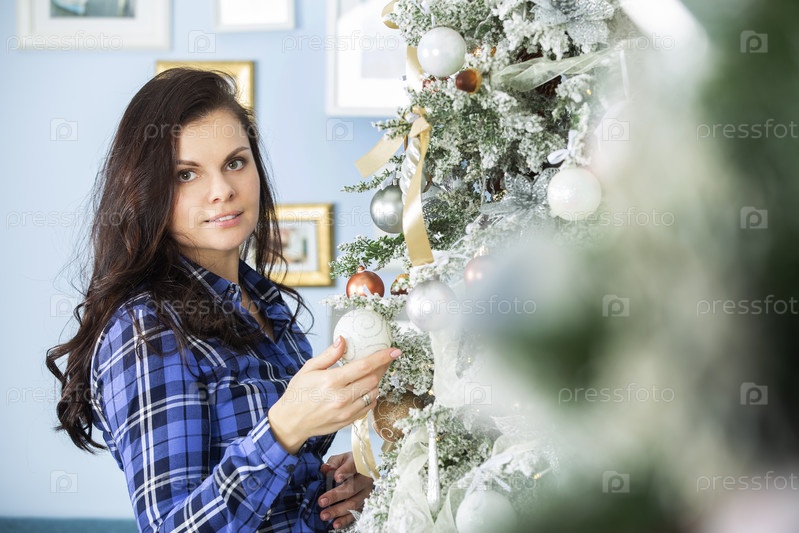 Россия. Санкт-Петербург. Праздник Новый год. Девушка у новогодней елки с украшениями. Новогодние праздники. Девочка возле рождественской ёлки с декорациями