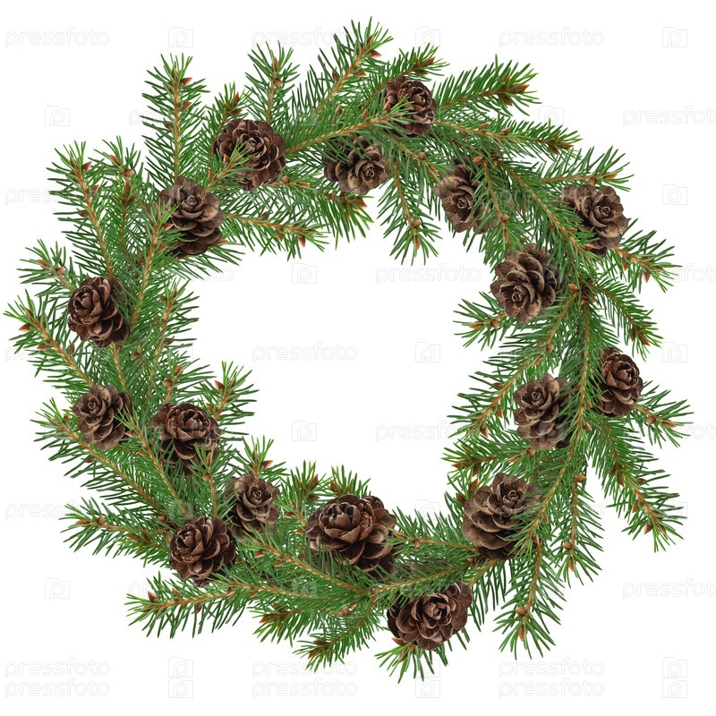 Рождественский еловый венок украшен сосновыми шишками на белом фоне