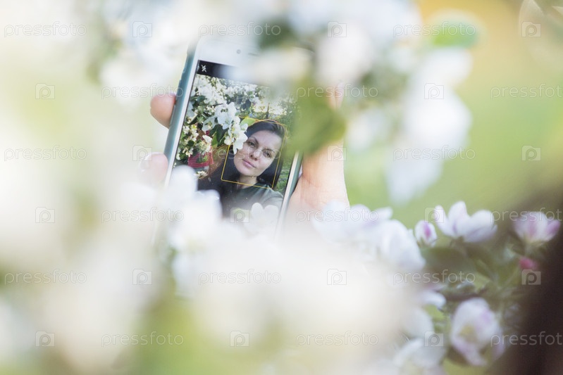 Россия. Санкт-Петербург. Селфи. Телефон с фотографией среди ветвей цветущей яблони