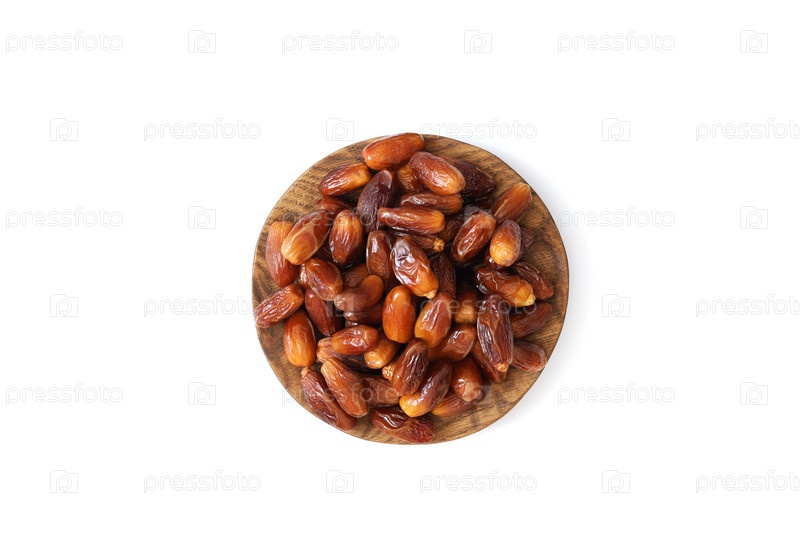 Даты в деревянной тарелке, изолированные на белом фоне. Сухофрукты. Натуральная здоровая пища. Вид сверху