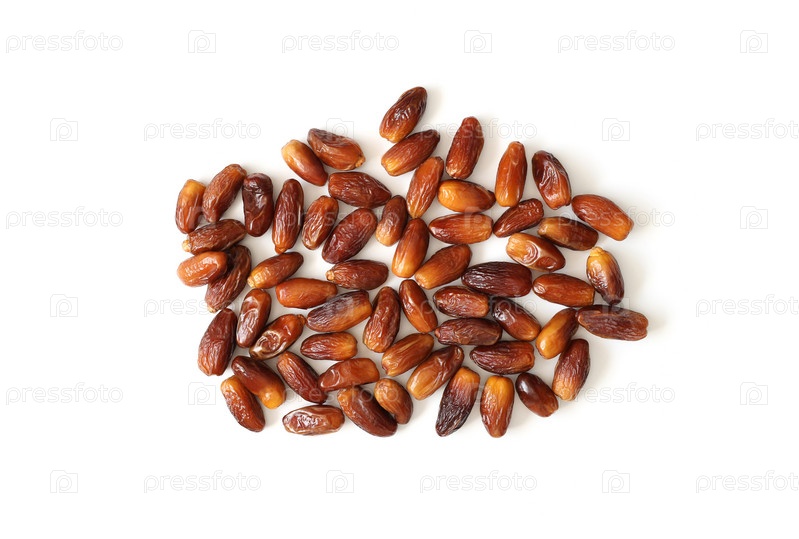 Куча сушеных фиников, изолированные на белом фоне. Восточные сладости. Плоская планировка, вид сверху