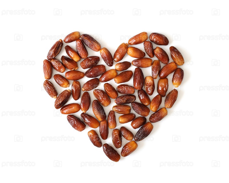 Сушеные финики в форме сердца, изолированные на белом фоне. Здоровые фрукты. Концепция любви к еде. Вид сверху, плоская планировка
