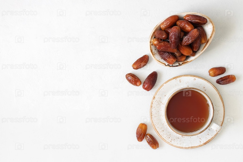 Сушеные финики в миске и чайный напиток на белом фоне с копией пространства. Традиционные арабские сладости. Популярная еда для Рамадана. Вид сверху, плоская планировка