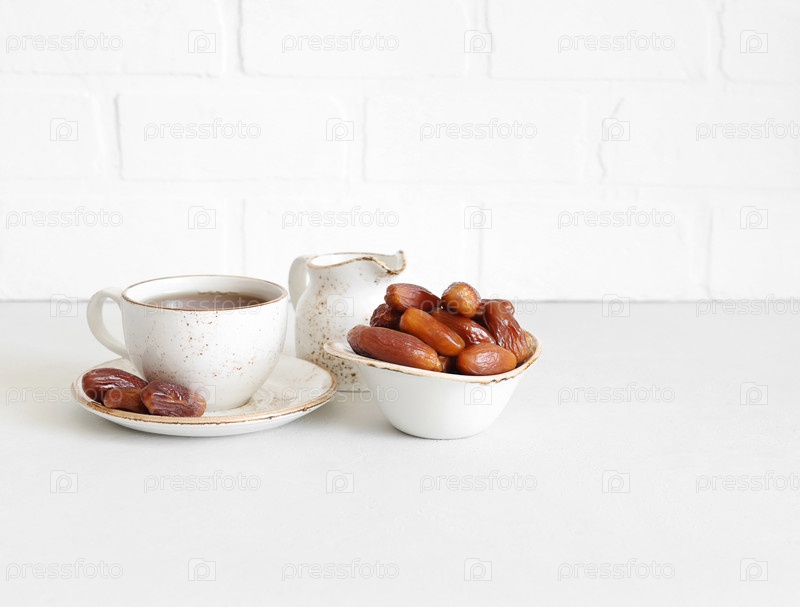 Сушеные финики и чайный напиток на белом фоне с копией пространства. Традиционная восточная еда. Натуральные сладости. Здоровый завтрак