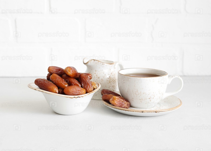 Чай и сушеные финики в миске на белом фоне. Турецкие сладости. Натуральная здоровая пища
