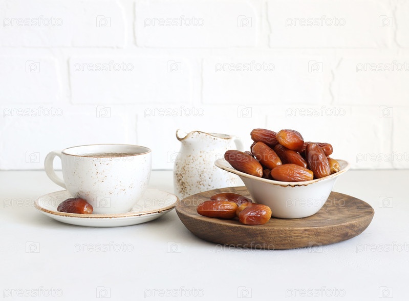 Сушеные финики в миске и чашка чая на белом фоне. Завтрак с натуральными полезными сладостями. Традиционная арабская еда